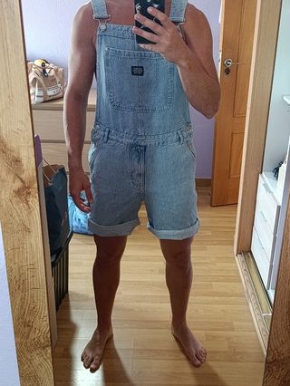 Peto vaquero corto para hombre, en buen estado. + Regalo otro peto algo más usado. - Diseño clásico. - Color azul claro. - Talla M.