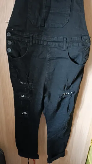 Peto vaquero de color negro con un diseño desgarrado. - Tirantes ajustables. - Bolsillos delanteros y traseros. - Estilo moderno y urbano.