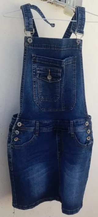 Peto vaquero de estilo tejano. - Tirantes ajustables. - Bolsillos delanteros y traseros. - Cierre lateral con botones.