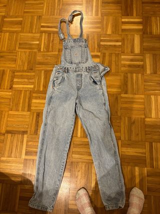 Pantalón peto vaquero para niña. En muy buen estado. Apenas se ha usado. - Tirantes ajustables con botones. - Bolsillos delanteros y traseros. - Diseño con costuras marcadas.