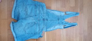 Peto azul vaquero corto Es talla M pero talla un poco pequeño Tirantes ajustables Dos bolsillos por delante a los lados (y uno más pequeño), dos detrás y uno arriba en el medio, dividido por la mitad Dos botones a cada lado Bastante usado pero en muy buen estado