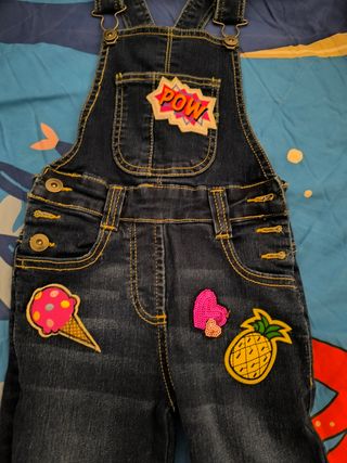 Peto vaquero para niña con divertidos parches. - Parche de POW en el bolsillo. - Parche de helado. - Parche de piña. - Parche de mariposa. Sin estrenar. No tiene etiqueta.