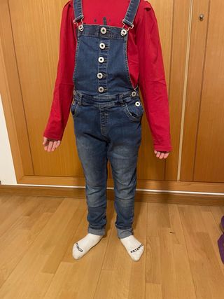 Peto vaquero de estilo casual. - Cierre de botones en la parte delantera. - Bolsillos en la parte delantera y trasera. - Tirantes ajustables. Talla xs de mujer o 152 de niña
