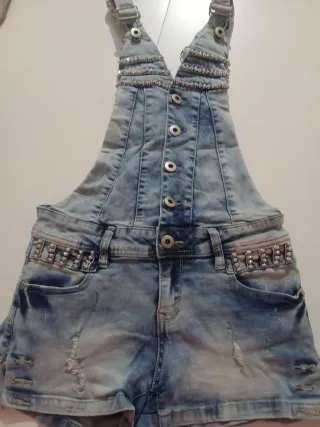 Peto vaquero corto de tela vaquera. Usado en excelente estado. Al ser talla 34 puede incluso servir para talla 14 años niña - Tirantes ajustables. - Bolsillos delanteros y traseros. - Detalle de rotos y deshilachado en los bajos.