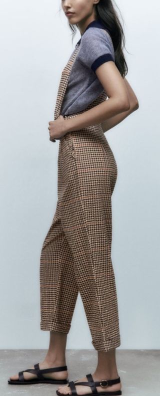 Precioso vestido peto de Zara, ideal para cualquier ocasión. Es de color marrón y blanco con estampado de cuadros. - Diseño de peto con tirantes. - Corte a la altura de la rodilla. - Bolsillos laterales.