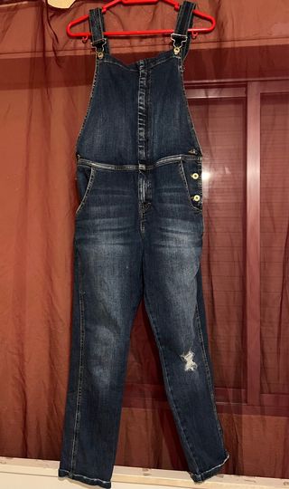 Peto vaquero de color azul. Está en buen estado, aunque tiene rotos en las piernas del propio diseño. - Diseño clásico de peto. - Ajustable con tirantes. - Bolsillos funcionales.