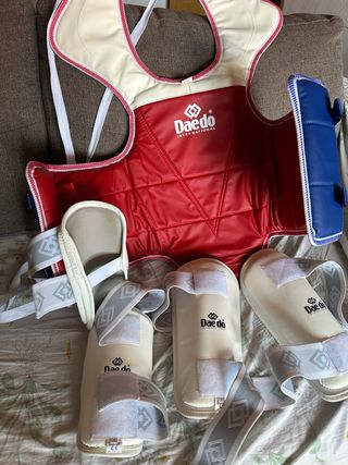 Conjunto de equipación para Taekwondo. - Peto protector reversible en rojo y azul. - Protectores de antebrazo y espinilla. - Cintas de sujeción ajustables.