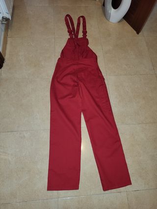 Mono peto de mujer pantalón pierna ancha con bolsillos tejido algodón grueso vaquero con flores muy bonito es talla M pero da para L más bien.Esta sin usar ver sin compromiso.valdria para embarazada