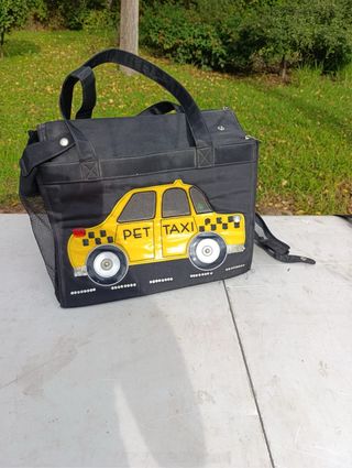 Práctica maleta de transporte para mascotas con un divertido diseño de taxi. - Diseño de taxi amarillo. - Laterales de malla para ventilación. - Asas de transporte resistentes. se envia
