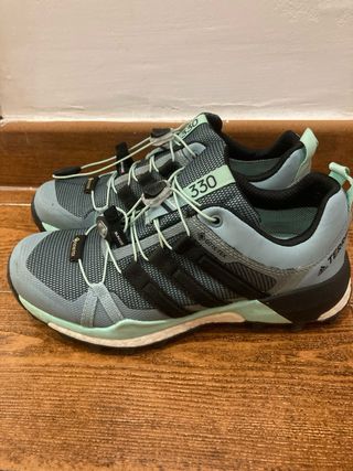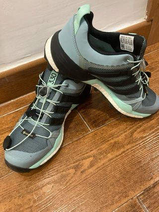 Zapatillas de senderismo Adidas Terrex con tecnología Gore-Tex. - Color gris y verde azulado. - Cierre rápido con cordones. - Suela de goma para mayor agarre. Son talla 36 y 2/3, sólo usadas en 3 salidas por montaña, se vende por cambio de calzado a barefoot.