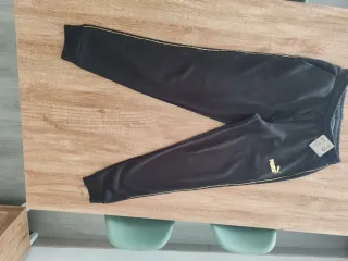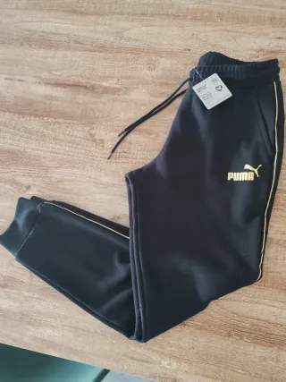 Pantalón deportivo de la marca Puma en talla M. Diseñado para hombre, combina comodidad y estilo. - Color principal negro con detalles dorados. - Cintura elástica con cordón ajustable. - Puños elásticos en los tobillos. - Logo de Puma bordado en dorado.