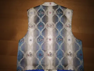 Elegante chaleco con un diseño estampado que combina tonos azules y plateados, adornado con delicadas flores. - Diseño floral. - Forro interior azul. - Bolsillos frontales.