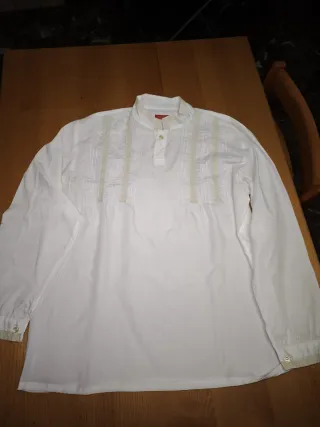 Chaleco fallero de color blanco, con detalles de encaje y botones. - Cuello mao. - Manga larga. - Puños abotonados con encaje. - Adornos de encaje en la pechera.