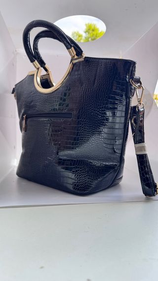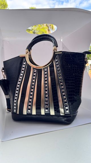 Elegante bolso de dama con un diseño llamativo. - Acabado texturizado tipo piel de cocodrilo. - Detalles de tiras verticales en dorado. - Adornado con pequeñas incrustaciones brillantes. - Asa superior dorada. - Incluye correa para colgar.