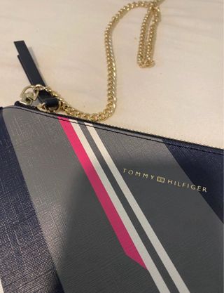 Bolso de mano con cadena de Tommy Hilfiger y diseño de rayas. - Diseño de rayas en azul marino, gris, blanco, rosa y amarillo. - Asa de cadena dorada. - Cierre de cremallera.