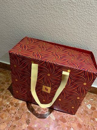 Elegante bolsa de regalo Nespresso con un diseño festivo y llamativo. - Patrón de remolinos en tonos rojos y dorados. - Asas de tela resistentes. - Logo de Nespresso en la parte frontal.