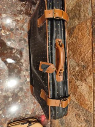 Maleta de estilo vintage con un diseño clásico. - Patrón de monograma. - Ribetes y asas de cuero. - Cierre con hebillas.