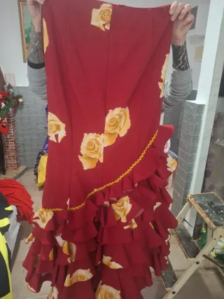 Traje de flamenca para baile. Diseño elegante con volantes en las mangas y en la falda.Usado solo 1 dia. Se puede entrar - Escote en pico con detalles. - Mangas acampanadas con volantes. - Falda larga con volantes en el bajo y abertura.