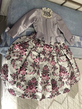 Traje para niña entre 5/6 años , depende de cómo esté desarrollada , el precio es por la falda y corpiño solo, es en tono gris el traje , para aderezo en plata. La falda se confeccionó y nunca se estrenó .