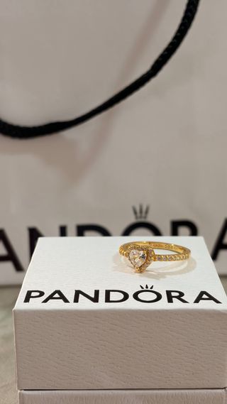 Elegante anillo Pandora con diseño de corazón. - Baño de oro. - Circonitas cúbicas transparentes. - Detalle perfecto para San Valentín - Talla 54, 56