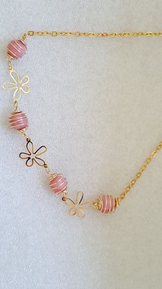Elegante collar bañado en oro de 18 quilates, adornado con cuarzo rosa y delicados detalles de flores. Hecho a mano - Diseño con cuentas de cuarzo rosa. - Colgantes en forma de flor. - Cadena bañada en oro de 18K.