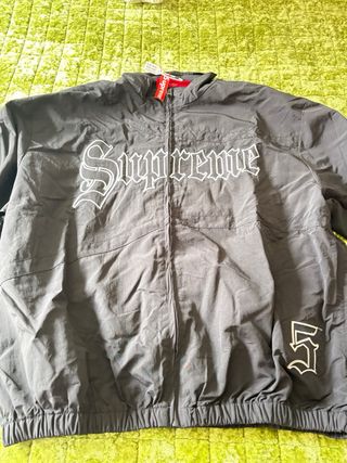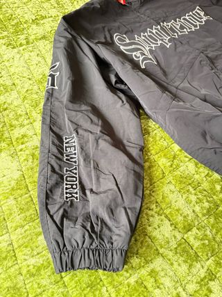 Chaqueta Supreme de color negro con detalles blancos. - Logo de Supreme en la parte delantera. - Inscripción NEW YORK en la manga. - Puños elásticos.