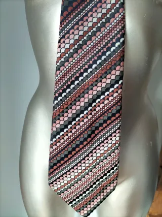 Corbata con un diseño geométrico llamativo y colores vibrantes. - Estampado de escamas en diagonal. - Combinación de tonos marrones y rosas.