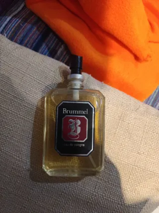 Frasco de colonia Brummel. - Etiqueta con el logo de la marca. - Líquido de color ámbar.
