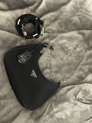 Bolso en color negro. Un clásico renovado con un toque moderno. - Nylon - Cadena plateada - Correa ajustable - Logo triangular de Prada