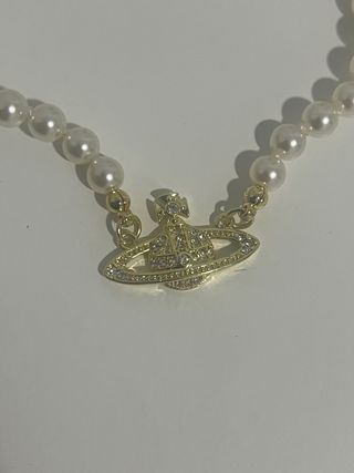 Elegante collar con perlas y el icónico Orb de Vivienne Westwood. - Diseño con perlas blancas. - Detalle central Orb en dorado con circonitas.