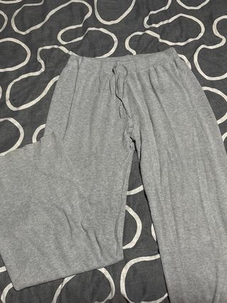 Conjunto de punto con canalé en color gris. La cintura es ajustable con cordón. La camiseta tiene tachuelas brillantes. - Tejido suave y cómodo. - Diseño de pierna ancha.