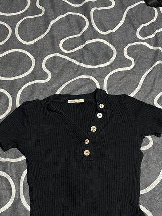 Camiseta corta de canalé con un diseño moderno y detalles que marcan la diferencia. - Cuello en V con botones. - Manga corta. - Tejido elástico y cómodo.