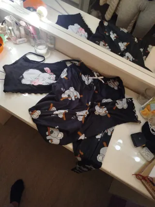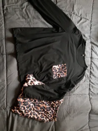 Conjunto de pijama compuesto por un top y unos shorts con un llamativo estampado. - Top negro con tirantes finos. - Shorts con estampado de leopardo. - Detalle de volante en el bajo del top y los shorts.5€ cada una son tallas diferentes