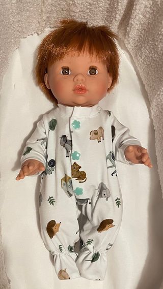 Pijama de una pieza con estampado de granja para muñecas tipo Minikane. - Diseño de manga larga. - Cierre de botones a presión. - Estampado de animales de granja y elementos naturales. - Muñeco no incluido