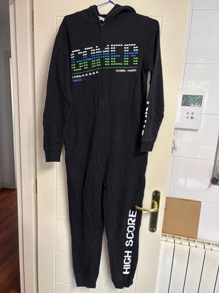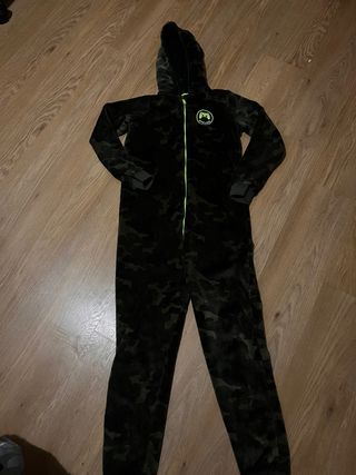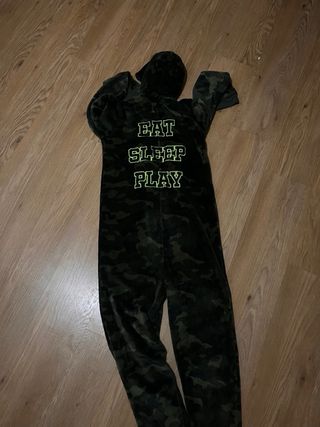 Pijama de cuerpo completo con estampado militar. - Diseño de camuflaje. - Cremallera frontal. - Capucha integrada. La talla es 13-14 años, pero le cabe a alguien que mida 1,65 o menos