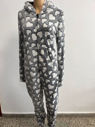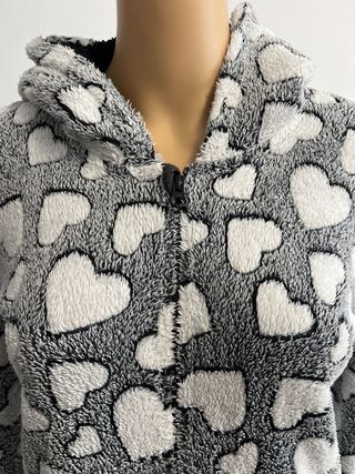Pijama entero de tejido suave con un divertido estampado de corazones. Es cómodo y perfecto para estar en casa. - Diseño de cuerpo entero con capucha. - Cierre frontal con cremallera. - Dos bolsillos delanteros.