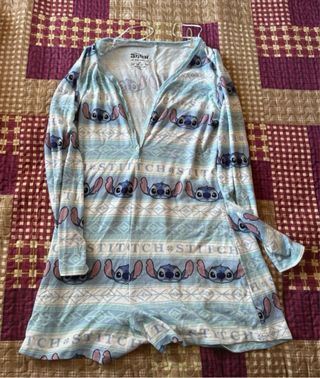 Pijama entero con estampado de Stitch. Ideal para estar cómodo en casa. - En perfecto estado, sin apenas uso, tal y como se muestra. Para mi gusto es bastante elástico y cómodo, con varios botones en la parte de delante, es enterizo arriba manga larga y abajo pantalón corto y talla de la 40 hasta la 42. - Diseño con manga larga. - Cierre de botones en la parte delantera. - Estampado repetido de Stitch y patrones geométricos.