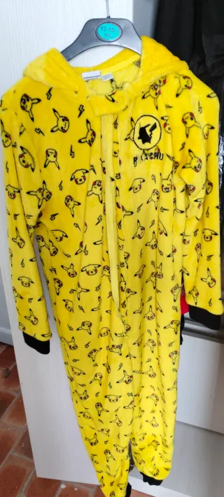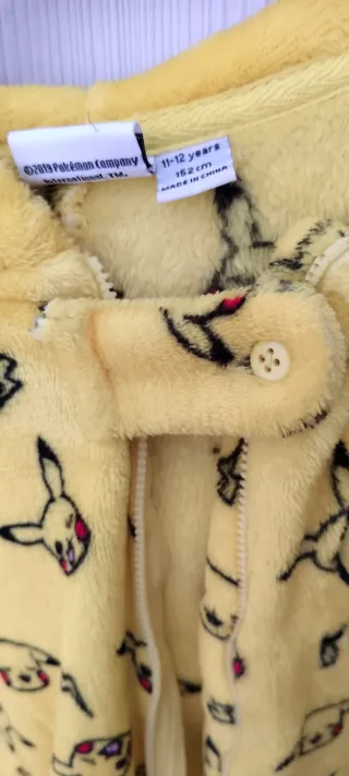 Pijama entero con diseño de Pikachu, ideal para estar cómodo en casa y como disfraz para carnaval. - Material suave y cálido. - Capucha con detalles de orejas y cara de Pikachu. - Rayas marrones en el torso y cola. - Cierre frontal con botones.