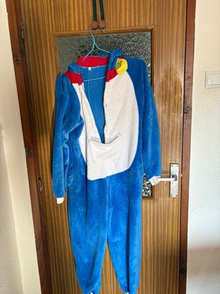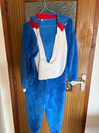 Pijama entero de forro polar con estampado de Sonic. Es muy calentito y cómodo. - Diseño con capucha de Sonic. - Estampado de Sonic por toda la prenda. - Cierre de cremallera frontal. - Tiene un agujero que se ve en la última foto.