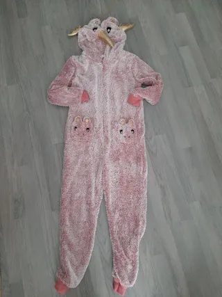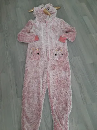 Pijama entero con capucha, ideal para estar cómodo en casa. Talla 12. - Material suave y cálido. - Cierre de cremallera frontal. - Diseño de unicornio.