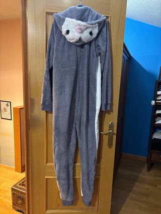 Disfraz de pijama entero con diseño de gato negro. Es cómodo y divertido. Talla grande. Para 1,65-1,70 de altura. Tiene cola. Muy caliente, si se usa de disfraz se puede llevar ropa debajo. Muy poco uso. - Capucha con orejas y detalles de cara de gato. - Cierre frontal con cremallera. - Puños elásticos en mangas y piernas.