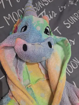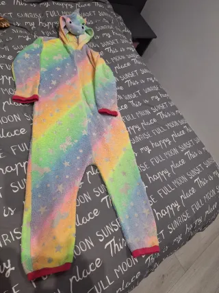 Pijama entero con diseño de unicornio y detalles divertidos. Perfecto para estar cómodo en casa. - Cierre frontal con cremallera. - Capucha con orejas y cuerno de unicornio. - Adorno de alitas traseras. - Cara sonriente de un personaje en la parte superior.