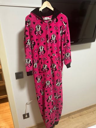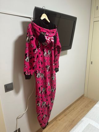 Pijama entero de Disney con estampado de Minnie Mouse y lazos. - Material suave y cálido, ideal para el invierno. - Diseño con capucha y cremallera frontal. - Estampado divertido y colorido.
