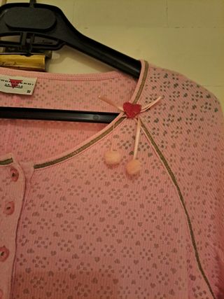 Parte de arriba de pijama de la marca La Perla. - Diseño con manga larga. - Cuello redondo con botones. - Tejido con estampado. - 80% algodón y 20% poliester. - Adorno de pompón y corazón en el hombro. - Ribeteado con un vivo verde.