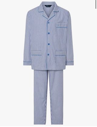 Conjunto de pijama largo para hombre con un diseño clásico de rayas. - Camisa con cuello solapa y botones. - Dos bolsillos en la parte delantera de la camisa. - Pantalón largo. - Ribetes en contraste.