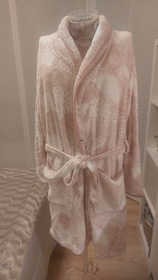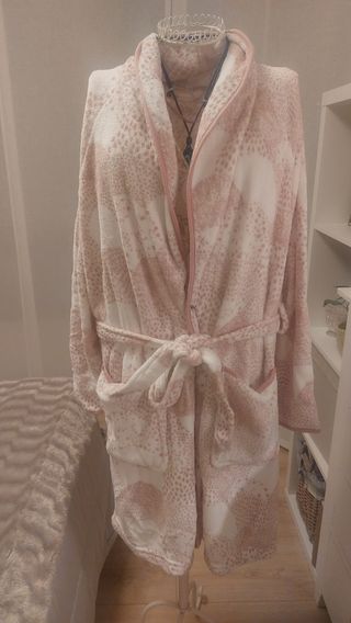 Bata de invierno. Cruzada con cinturón. Colores rosa y blanco