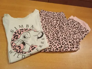 Pijama de la marca Disney con un bonito diseño de Simba, el protagonista de El Rey León. Está en muy buen estado. - Camiseta de manga corta. - Pantalones cortos con estampado de leopardo. - Perfecto para dormir o usar en casa.
