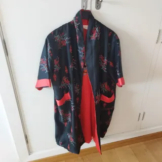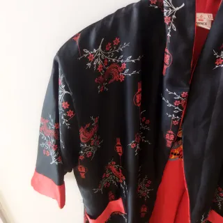 Elegante bata de seda con un diseño inspirado en motivos orientales. Es reversible. Se puede llevar por la parte negra o la roja. - Tiene bolsillos a ambos lados. - Estampado de flores y farolillos chinos. - Ribetes en contraste en mangas y bolsillos. - Corte holgado y cómodo.