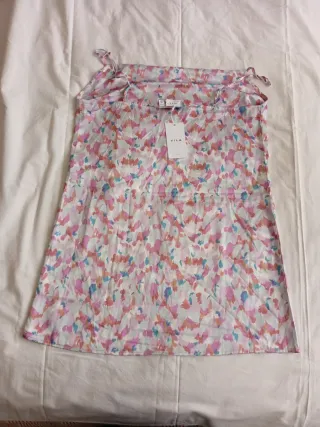 Camisón corto con estampado llamativo y tirantes finos. - Imitación seda. Poliester - Diseño multicolor con toques rosas - Tirantes ajustables.