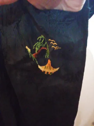 Elegante bata japonesa de seda con intrincados bordados. - Diseño floral y paisajístico. - Cierre con nudos tradicionales. - Acabado satinado.